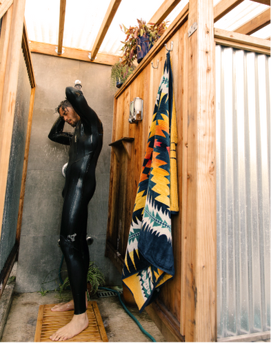 Surfers can store equipment in outdoor club space, with after-hours access to lockers, hot-showers and garden. Additional features at Pacifica include a heated bench and sauna to ease the transition from the chilly waters of the north Pacific Ocean.