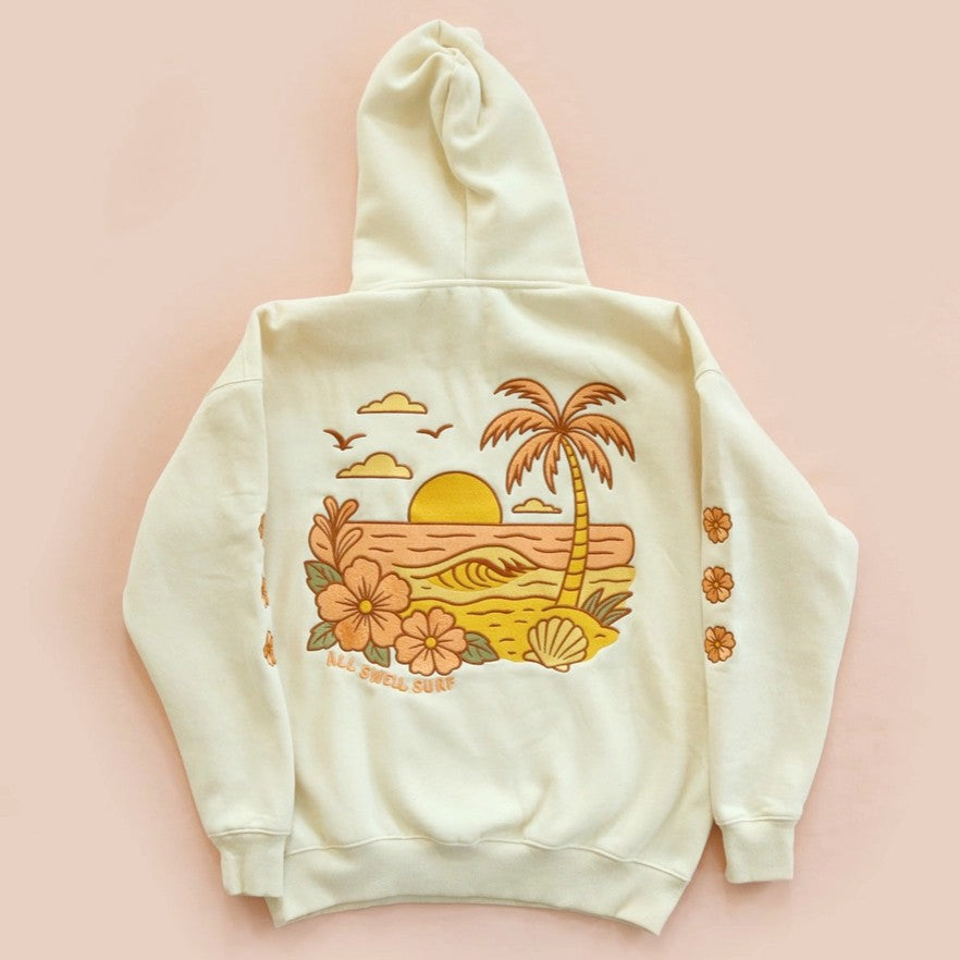Say aloha to your new favorite hoodie. The Sunset Hoodie is made from ultra-soft heavyweight fabric that feels like a warm hug after a sunrise session. With detailed embroidery on the back and sleeves and on the hood, this cozy pullover is basically a tropical daydream in sweatshirt form. Whether you’re chasing waves or just cruising through town, it’s your go-to for instant joy, comfort, and All Swell vibes.